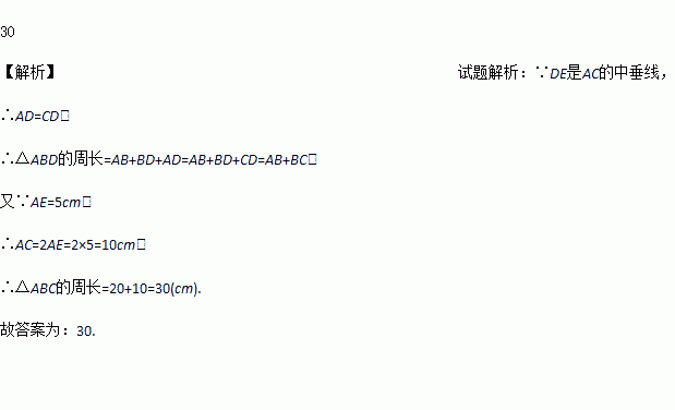 如图,在△ABC中,AC的垂直平分线交AC于E,交BC于D,△ABD的周长为20cm,AE=5cm,则△ABC的周长是_____cm.