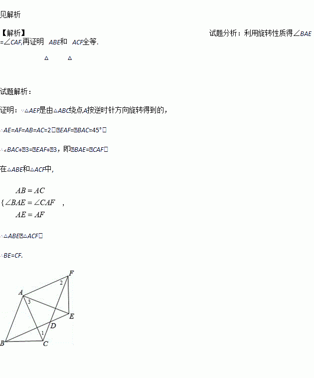 如图,△ABC中,AB=AC=2,∠BAC=45°,△AEF是由△ABC绕点A按逆时针方向旋转得到的,连接BE、CF相交于点D,求证:BE=CF.