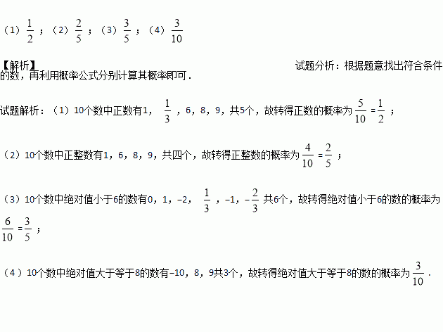 如图是芳芳设计的自由转动的转盘,上面写有10个有理数。想想看,转得下列各数的概率是多少?