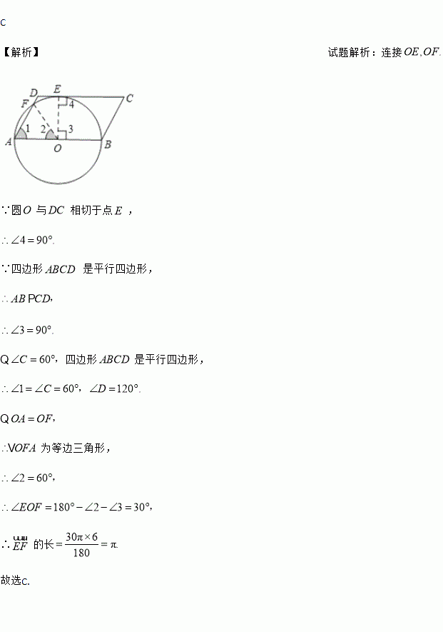 (2016·山西中考)如图,在?ABCD中,AB为⊙O的直径,⊙O与DC相切于点E,与AD相交于点F,已知AB=12,∠C=60°,则弧EF的长为( )