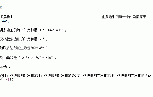 一个多边形的每一个内角都等于144°,则这个多边形的内角和是( )