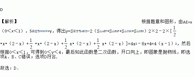 如图正方形ABCD的边长为2,点E,F,G,H分别在AD,AB,BC,CD上,且EA=FB=GC=HD,分别将△AEF,△BFG,△CGH,△DHE沿EF,FG,GH,HE翻折,得四边形MNKP,设AE=x(0<x<1),S四边形MNKP=y,则y关于x的函数图象大致为( )