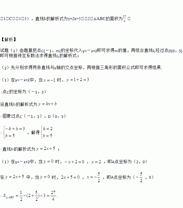 如图,直线l1的解析式为y=﹣x+2,l1与x轴交于点B,直线l2经过点D(0,5),与直线l1交于点C(﹣1,m),且与x轴交于点A,