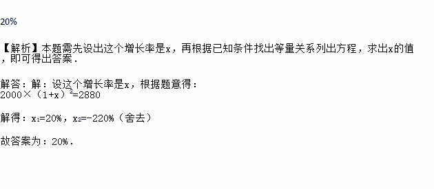 某小区2010年屋顶绿化面积为2000平方米,计划2012年屋顶绿化面积要达到2880平方米.如果每年屋顶绿化面积的增长率相同,那么这个增长率是_________.