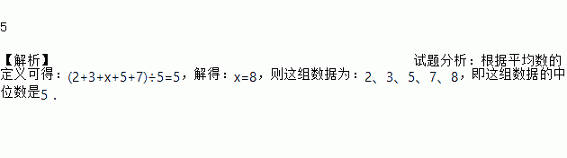 5 【解析】试题分析:根据平均数的定义可得:(2+3+x+5+7)÷5=5,解得:x=8,则这组数据为:2、3、5、7、8,即这组数据的中位数是5.