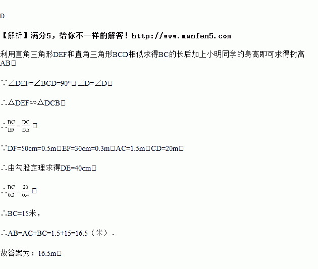 如图,小明同学用自制的直角三角形纸板DEF测量树的高度AB,他调整自己的位置,设法使斜边DF保持水平,并且边DE与点B在同一直线上.已知纸板的两条边DF=50cm,EF=30cm,测得边DF离地面的高度AC=1.5m,CD=20m,则树高AB为( )