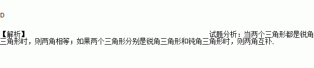 如果两个三角形中两条边和其中一边上的高对应相等,那么这两个三角形的第三条边所对的角的关系是 ( )