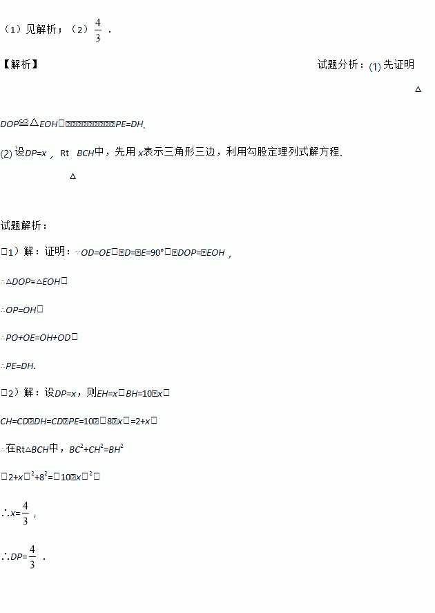 (1)见解析;(2). 【解析】试题分析:(1) 先证明△DOP≌△EOH,再利用等量代换得到PE=DH. (2) 设DP=x, Rt△BCH中,先用 x表示三角形三边,利用勾股定理列式解方程. 试题解析: (1)【解析】 证明:∵OD=OE,∠D=∠E=90°,∠DOP=∠EOH, ∴△DOP≌△EOH, ∴OP=OH, ∴PO+OE=OH+OD, ...