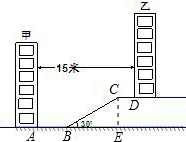 某住宅小区为了美化环境,增加绿地面积,决定在坡地上的甲楼和乙楼之间建一块斜坡草地,如图,已知两楼的水平距离为15米,距离甲楼2米(即AB=2米)开始修建坡角为30°的斜坡,斜坡的顶端距离乙楼4米(即CD=4米),求斜坡BC的长度(结果保留根号).