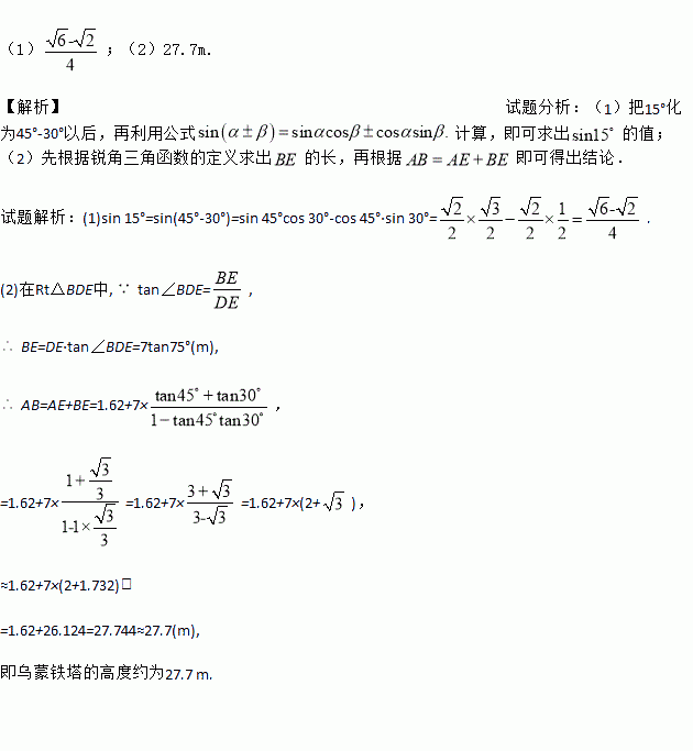 (2)乌蒙铁塔是六盘水市标志性建筑物之一,小华想用所学的知识来测量该铁塔的高度.如图,小华站在离铁塔底A距离7 m的C处,测得铁塔顶B的仰角为75°,小华的眼睛离地面的距离DC为1.62 m,请帮助小华求出乌蒙铁塔的高度.(结果精确到0.1 m.参考数据: