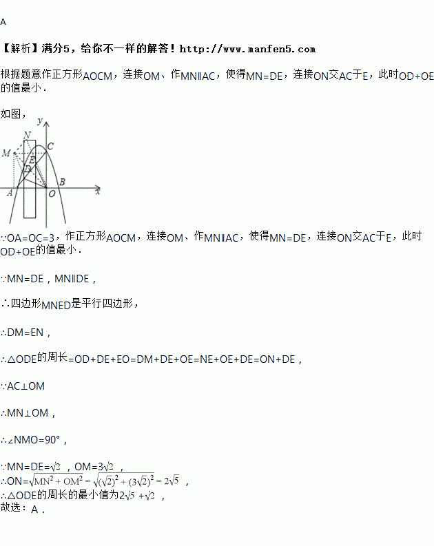 如图,抛物线与x轴交于A(﹣3,0),B(1,0),与y轴交于点C(0,3),连结AC,现有一宽度为1,长度足够的矩形沿x轴方向平移,交直线AC于点D和E,△ODE周长的最小值为( )