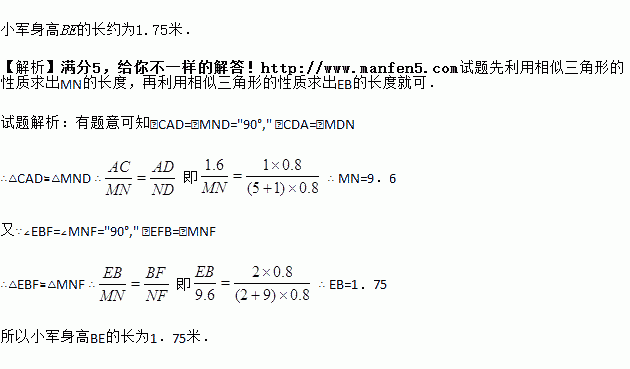 Íí·¹ºó£¬Ð¡´ÏºÍС¾üÔÚÉçÇø¹ã³¡É¢²½£¬Ð¡´ÏÎÊС¾ü£º¡°ÄãÓжà¸ß£¿¡±Ð¡¾üһʱÓïÈû£®Ð¡´Ï˼¿¼Æ¬¿Ì£¬ÌáÒéÓù㳡ÕÕÃ÷µÆÏµÄÓ°³¤¼°µØ×©³¤À´²âÁ¿Ð¡¾üµÄÉí¸ß£®ÓÚÊÇ£¬Á½ÈËÔÚµÆÏÂÑØÖ±ÏßNQÒÆ¶¯£¬Èçͼ£¬µ±Ð¡´ÏÕýºÃÕ¾Ôڹ㳡µÄAµã(¾àNµã5¿éµØ×©³¤)ʱ£¬ÆäÓ°³¤ADÇ¡ºÃΪ1¿éµØ×©³¤£»µ±Ð¡¾üÕýºÃÕ¾Ôڹ㳡µÄBµã(¾àNµã9¿éµØ×©³¤)ʱ£¬ÆäÓ°³¤BFÇ¡ºÃΪ2¿éµØ×©³¤£®ÒÑÖª¹ã³¡µØÃæÓɱ߳¤Îª0.8Ã×µÄÕý·½ÐεØ×©ÆÌ³É£¬Ð¡´ÏµÄÉí¸ßACΪ1.6Ã×£¬MN¡ÍNQ£¬AC¡ÍNQ£¬BE¡ÍNQ.ÇëÄã¸ù¾ÝÒÔÉÏÐÅÏ¢£¬Çó³öС¾üÉí¸ßBEµÄ³¤(½á¹û¾«È·µ½0.01Ã×)£®