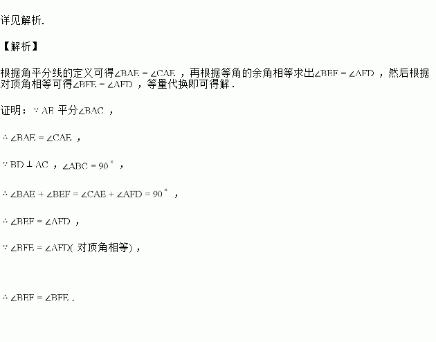 已知中,,BD是AC边上的高,AE平分,分别交BC、BD于点E、求证:.