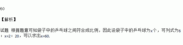 有一些乒乓球,不知其数量,先取6个作了标记,把它们放回袋中,混合均匀后又取了20个,发现含有两个做标记,可估计袋中乒乓球有______个