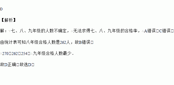 某校对全体学生开展心理健康知识测试,七、八、九三个年级共有800名学生,各年级的合格人数如表所示,则下列说法正确的是( )