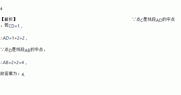 如图,点D是线段AB的中点,点C是线段AD的中点,若CD=1,则AB=________________.