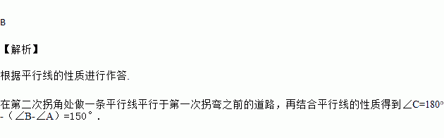 如图,一条公路修到湖边时,需拐弯绕道而过,如果第一次拐的∠A=120°,第二次拐的∠B=150°,第三次拐的∠C,这时的道路恰好和第一次拐弯之前的道路平行,则∠C是( )