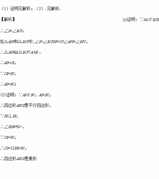 (本题满分10分)如图,在四边形ABCD中,AD∥BC,点E在BC的延长线上,CE=BC,连接AE,交CD边于点F,且CF=DF.(1)求证:AD=BC;(2)连接BD、DE,若BD⊥DE,求证:四边形ABCD为菱形.
