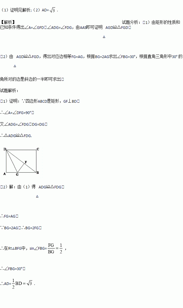 (1)求证:△ADG≌△FDG;(2)若BG=2AG,BD=2,求AD的长.