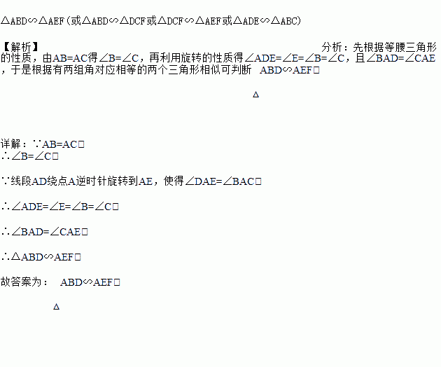 如图,在△ABC中,AB=AC,点D在边BC上,连接AD,将线段AD绕点A逆时针旋转到AE,使得∠DAE=∠BAC,连接DE交AC于F,请写出图中一对相似的三角形:____(只要写出一对即可).