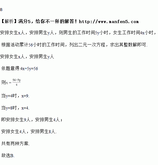 某抗战纪念馆馆长找到大学生团干部小张,联系青年志愿者在周日参与活动,活动累计56个小时的工作时间,需要每名男生工作5个小时,每名女生工作4个小时,小张可以安排学生参加活动的方案共有( )