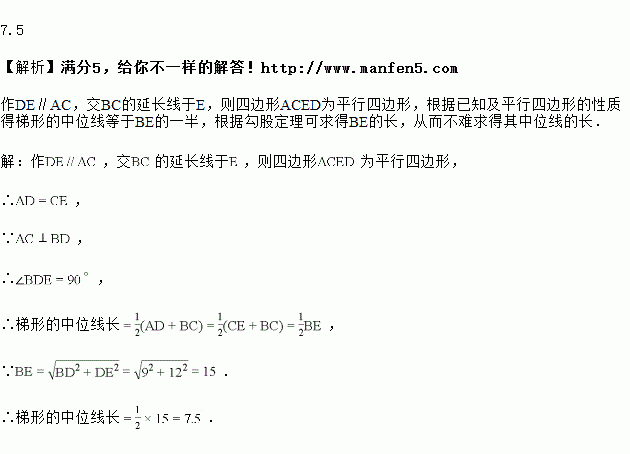 如图,在梯形中,,对角线,且,,求此梯形的中位线长.