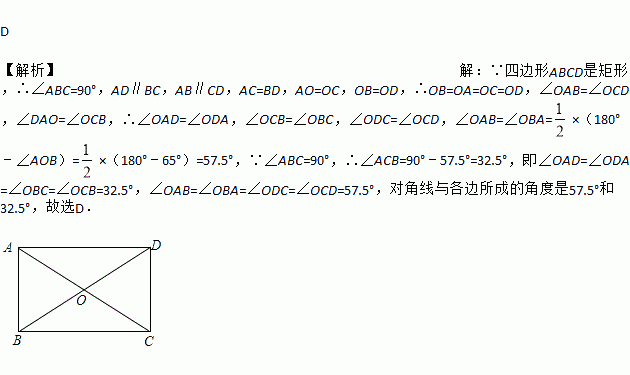D 【解析】【解析】 ∵四边形ABCD是矩形,∴∠ABC=90°,AD∥BC,AB∥CD,AC=BD,AO=OC,OB=OD,∴OB=OA=OC=OD,∠OAB=∠OCD,∠DAO=∠OCB,∴∠OAD=∠ODA,∠OCB=∠OBC,∠ODC=∠OCD,∠OAB=∠OBA=×(180°﹣∠AOB)=×(180°﹣65°)=57.5°,∵∠ABC=90°,∴∠ACB=90°﹣57.5°=32...