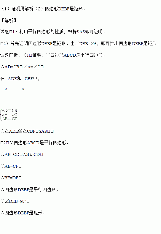 (2)若∠DEB=90°,求证:四边形DEBF是矩形.