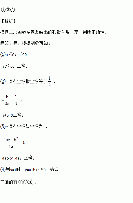 ,1),下列结论:①ac<0;②a+b=0;③4ac﹣b2=4a;④a+b+c<0.其中正确的是_______.
