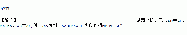 如图,点D在AB上,点E在AC上,CD与BE相交于点O,且AD=AE,AB=AC,若∠B=20°,则∠C=__________.