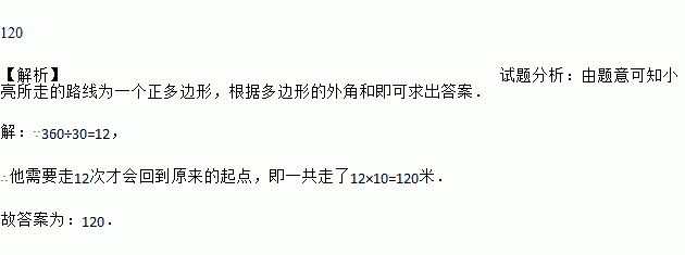 如图:小亮从A点出发,沿直线前进10米后向左转30度,再沿直线前进10米,又向左转30度,??照这样走下去,他第一次回到出发点A点时,一共走了______米?