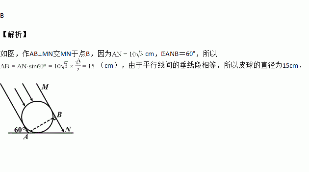 太阳光线与地面成60°的角,照射在地面上的一只皮球上,皮球在地面上的投影长是cm,则皮球的直径是( )