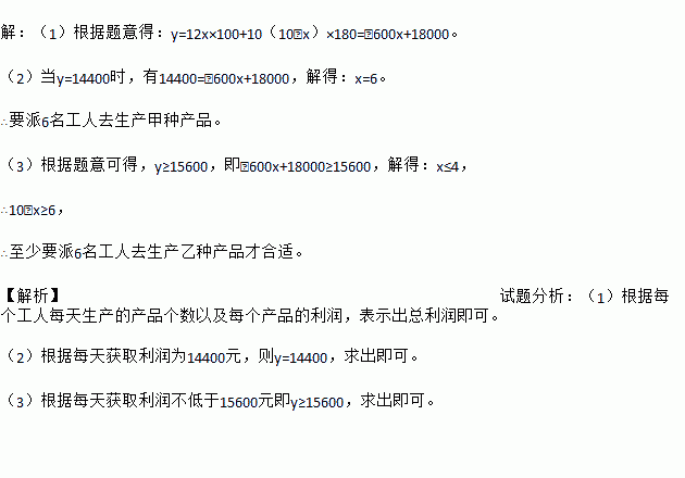 【解析】 (1)根据题意得:y=12x×100+10(10﹣x)×180=﹣600x+18000。 (2)当y=14400时,有14400=﹣600x+18000,解得:x=6。 ∴要派6名工人去生产甲种产品。 (3)根据题意可得,y≥15600,即﹣600x+18000≥15600,解得:x≤4, ∴10﹣x≥6, ∴至少要派6名工人去生产乙种产品才合适。 ...