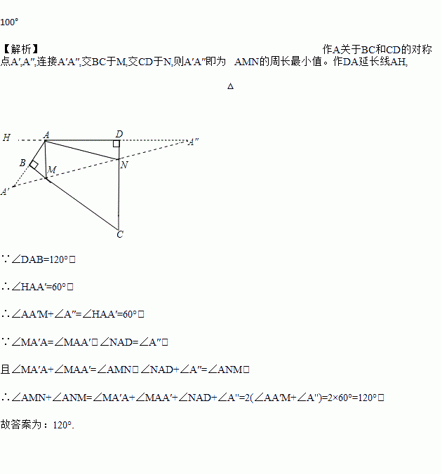 如图,四边形ABCD中,∠BAD=130°,∠B=∠D=90°,在BC、CD上分别找一点M、N,使△AMN周长最小时,则∠AMN+∠ANM的度数为 .