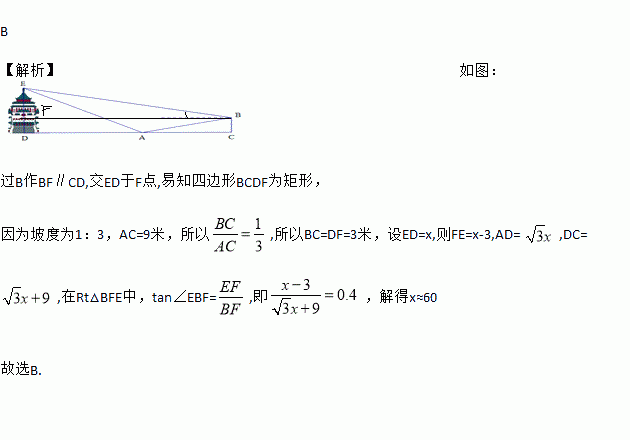 气魄雄伟的大礼堂座落在渝中区学田湾,它是一座仿古民族建筑.“五一”期间,小明和妈妈到重庆大礼堂参观游玩.参观结束后,穿过人民广场到达A处,回望礼堂,更显气势雄伟,金碧辉煌.此时,在A点观察到礼堂顶端的仰角为30°,沿着坡度为1:3的斜坡AB走一段距离到达B点,观察到礼堂顶端 的仰角是22°,测得点A与BC之间的水平距离
