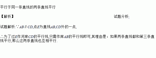如图所示,直线AB,CD是一条河的两岸,并且AB∥CD,点E为直线AB,CD外一点,现想过点E作河岸CD的平行线,只需过点E作AB的平行线即可,其理由是___________________
