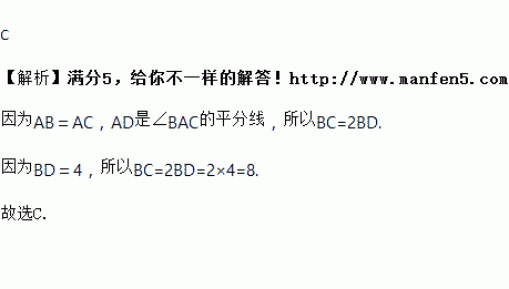 如图,△ABC中,AB=AC,AD是∠BAC的平分线.已知AB=5,AD=3,则BC的长为( )