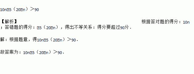 某次知识竞赛共有20道题,每一题答对得10分,答错或不答都扣5分,娜娜得分要超过90分,设她答对了n道题,则根据题意可列不等式 .