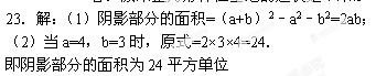 如图,根据图中信息解答下列问题: (1)用代数式表示图中阴影部分的面积; (5分) (2)当a=4,b=3时,求阴影部分的面积.(3分)