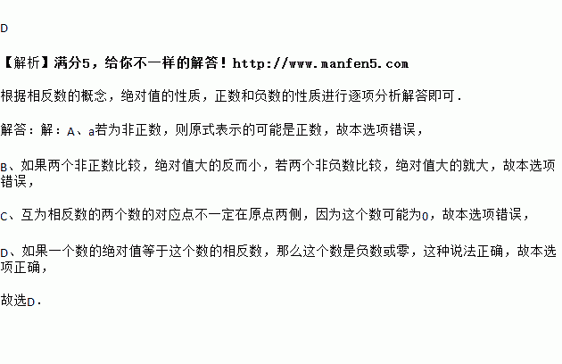 D. 如果一个数的绝对值等于这个数的相反数,那么这个数是负数或零