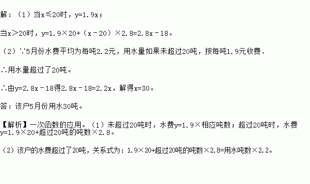 (2)若该城市某户5月份水费平均为每吨2.2元,求该户5月份用水多少吨?