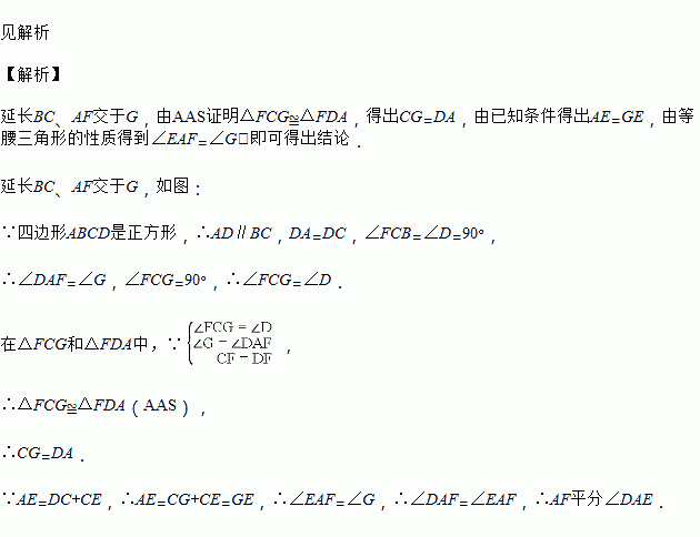 已知:如图,在正方形ABCD,E是BC边上一点,F是CD的中点,且AE = DC + CE. 求证:AF平分∠DAE.