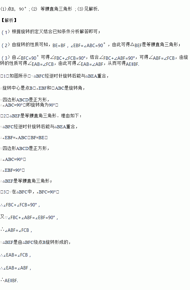 如图,正方形ABCD,点F为正方形ABCD内一点,△BFC逆时针旋转后能与△BEA重合.