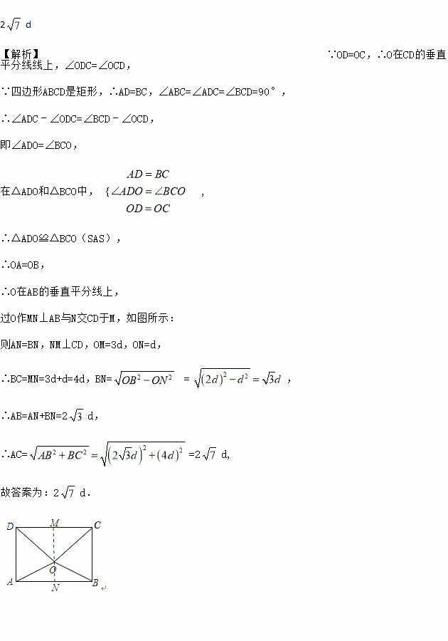 如图,O为矩形ABCD内的一点,满足OD=OC,若O点到边AB的距离为d,到边DC的距离为3d,且OB=2d,求该矩形对角线的长 ________
