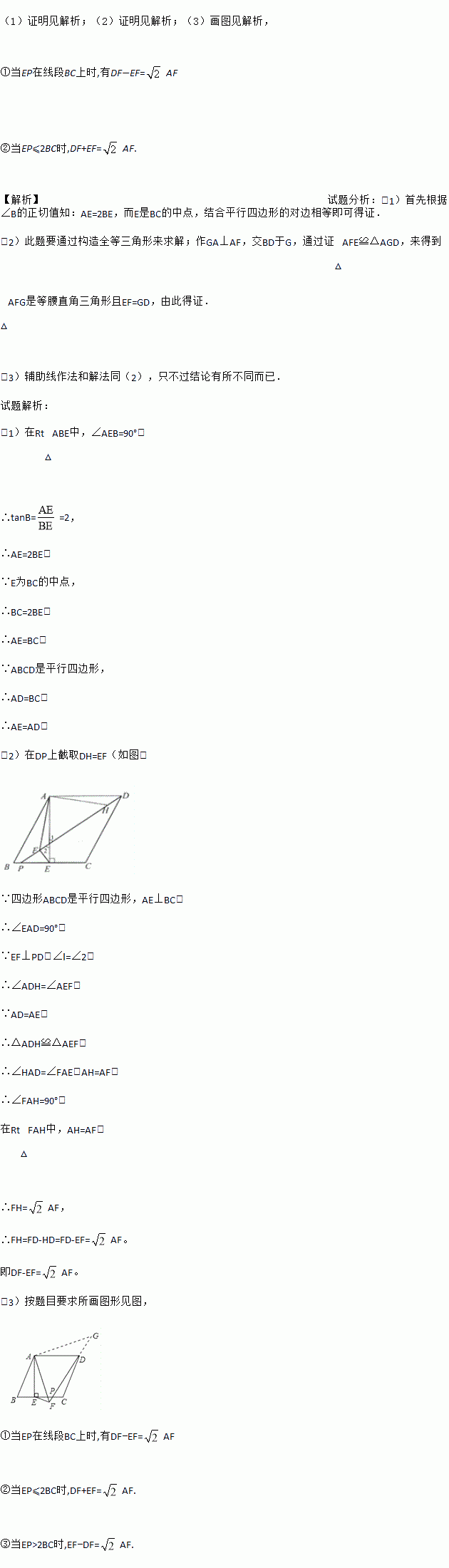 如图1,在□ABCD中,AE⊥BC于E,E恰为BC的中点,tanB=2。