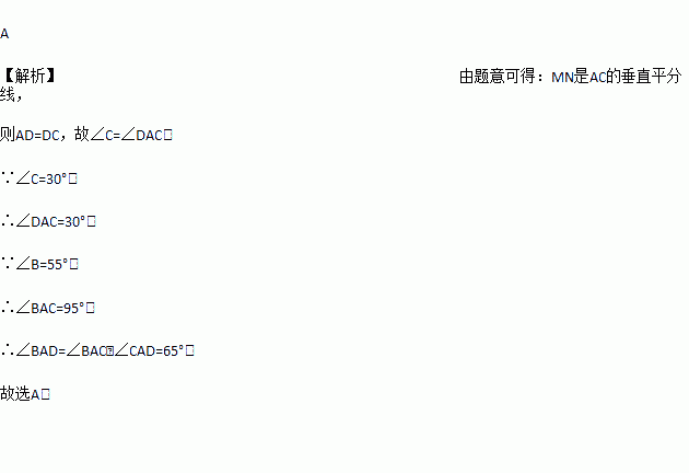 如图,在△ABC中,∠B=55°,∠C=30°,分别以点A和点C为圆心,大于