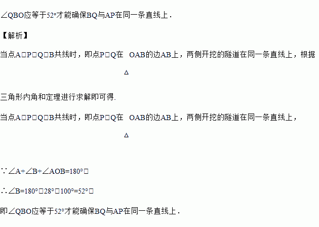 某工程队准备开挖一条隧道,为了缩短工期,必须在山的两侧同时开挖,为了确保两侧开挖的隧道在同一条直线上,测量人员在如图所示的同一高度定出了两个开挖点P和Q,然后在左边定出开挖的方向线AP,为了准确定出右边开挖的方向线BQ,测量人员取一个可以同时看到点A,P,Q的点O,测得∠A=28°,∠AOC=100°,那么∠QBO应等于多少度才能确保BQ与AP在同一条直线上?