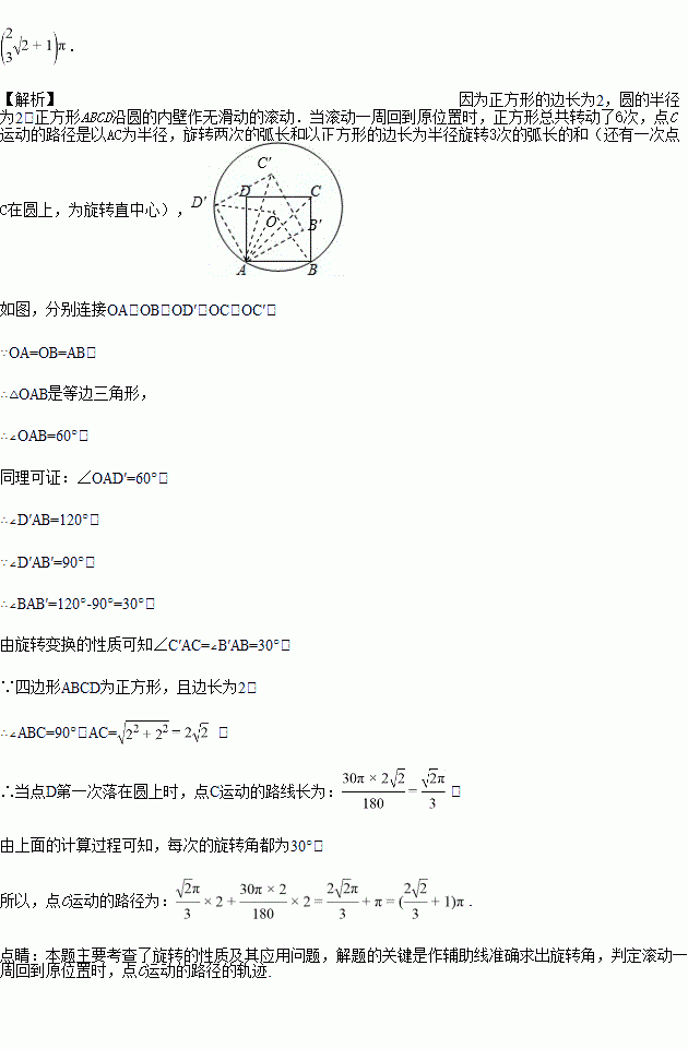 如图,边长为2的正方形ABCD的顶点A、B在一个半径为2的圆上, 顶点C、D在圆内,将正方形ABCD沿圆的内壁作无滑动的滚动.当滚动一周回到原位置时,点C运动的路径长为__ _.
