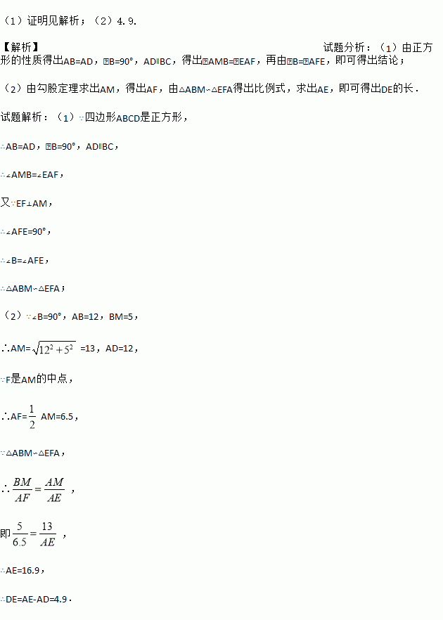 如图,正方形ABCD中,M为BC上一点,F是AM的中点,EF⊥AM,垂足为F,交AD的延长线于点E,交DC于点N.