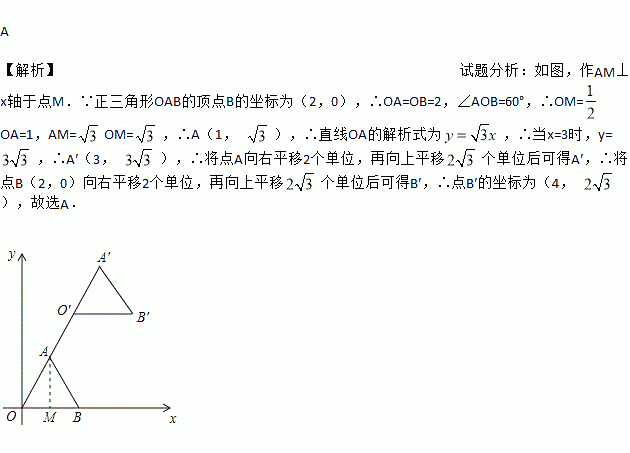 如图,在平面直角坐标系中,正三角形OAB的顶点B的坐标为(2,0),点A在第一象限内,将△OAB沿直线OA的方向平移至△O′A′B′的位置,此时点A′的横坐标为3,则点B′的坐标为( )